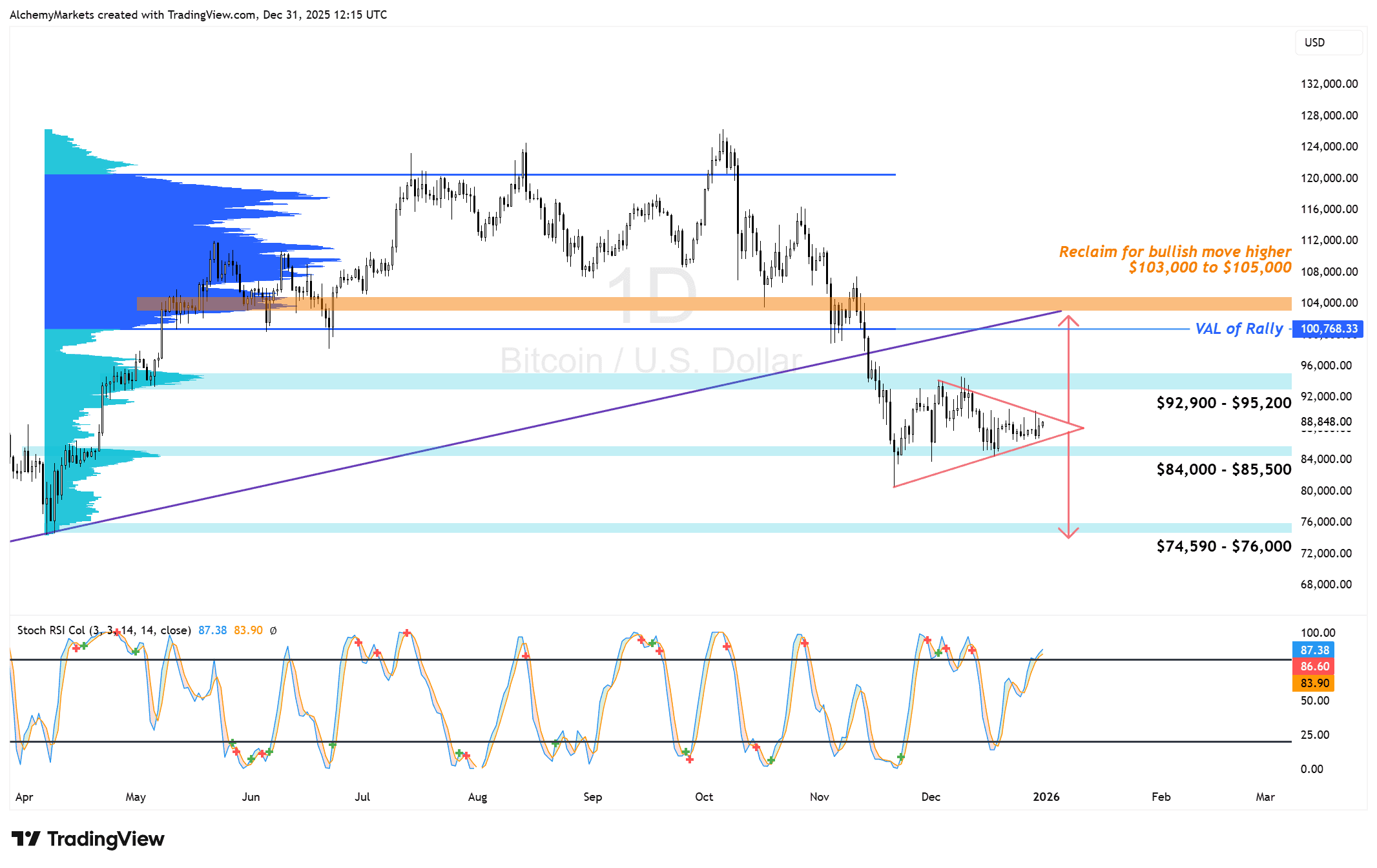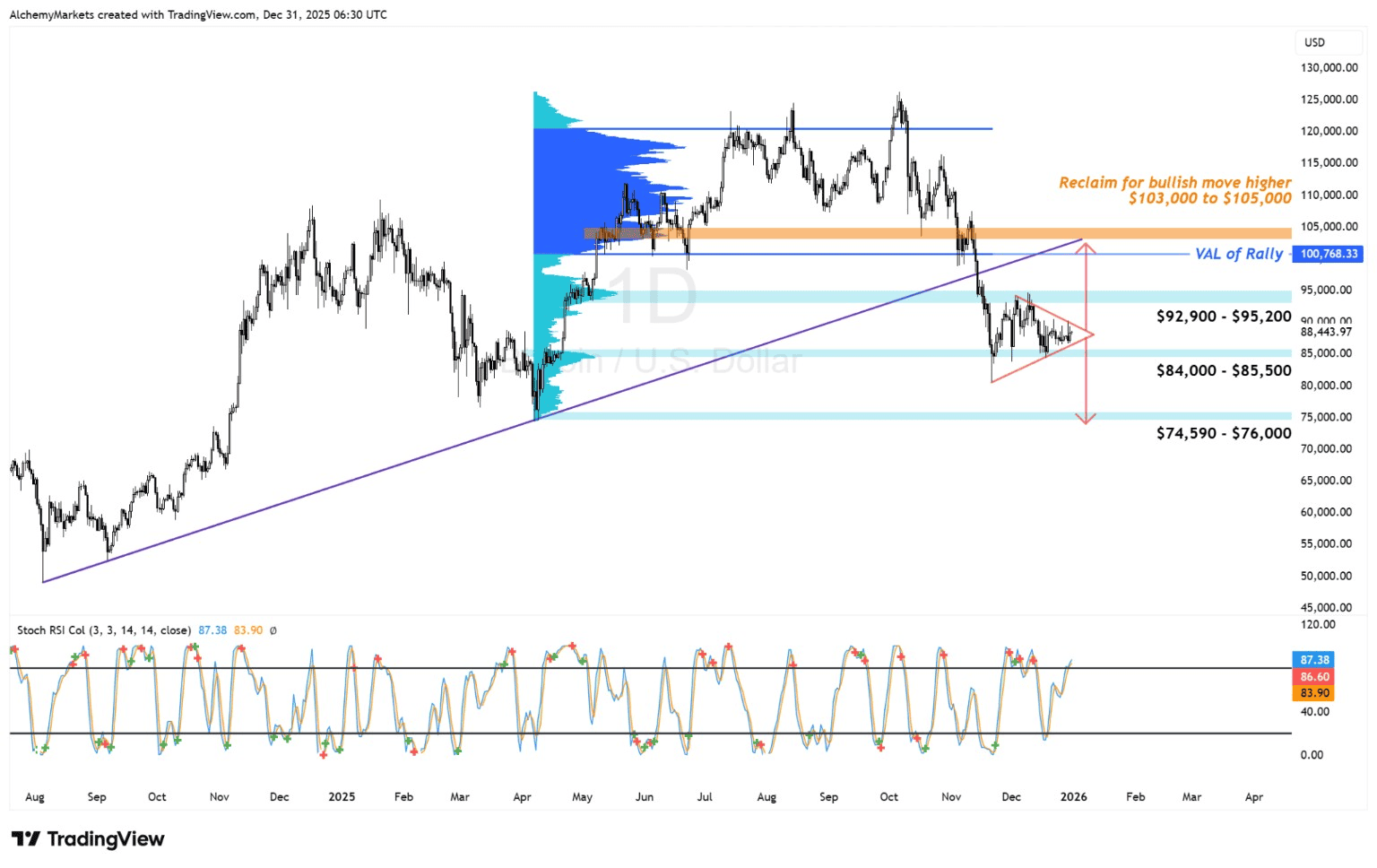 If the triangle resolves to the downside, the measured move points toward the mid-$70Ks, roughly $75,000.