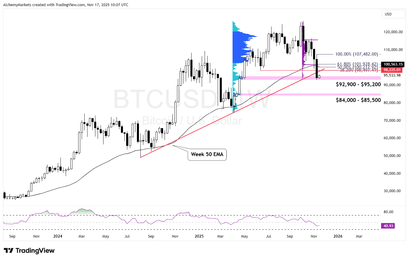 In the short term, watch whether the price can hold above $92,900. If we get a retracement, a genuinely bullish trend only comes back into play if price can reclaim and close above the prior high at $107,482 and, ideally, break and hold above the weekly 50 EMA.