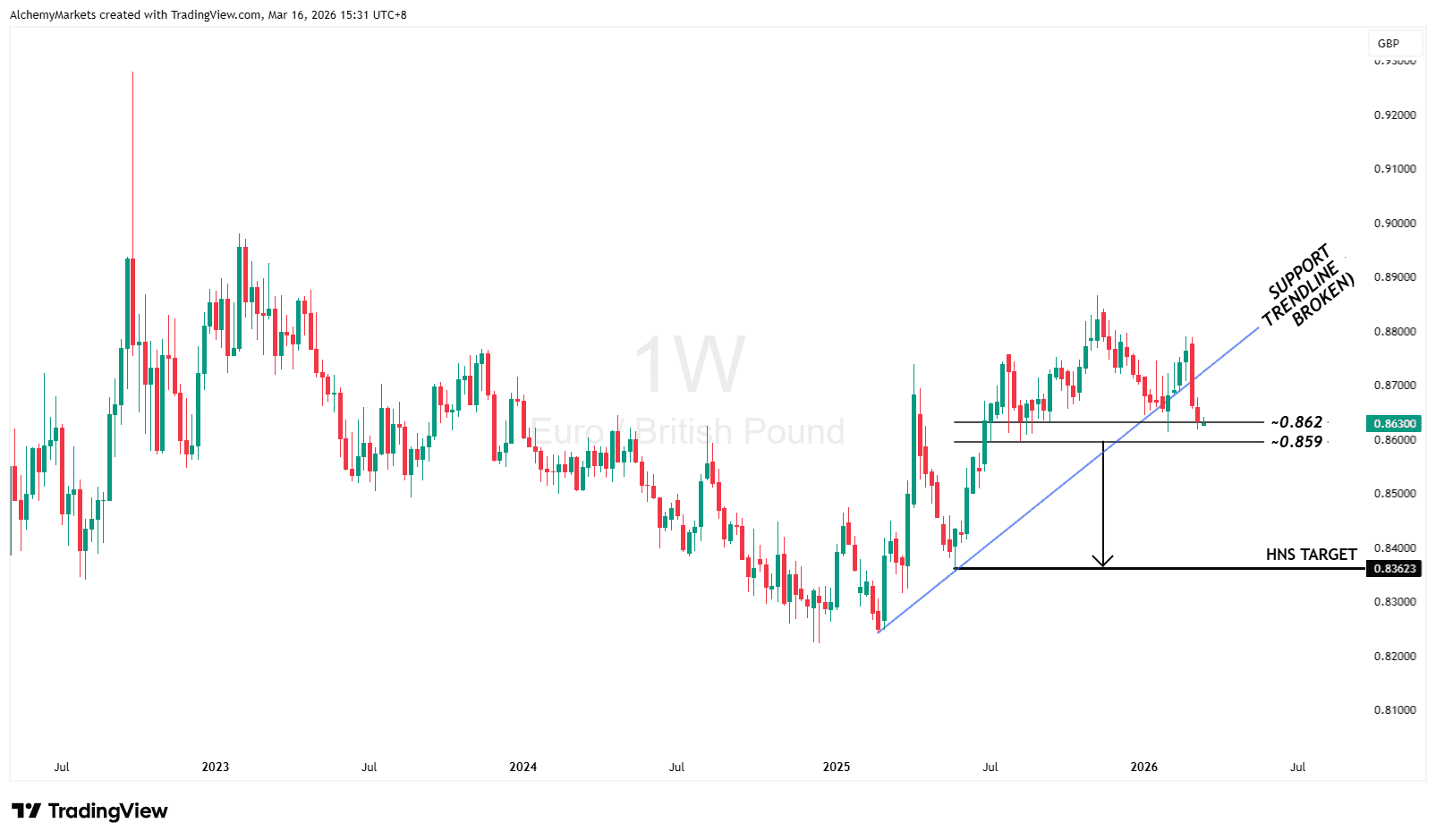 The EURUSD weekly chart shows the pair breaking below the rising channel that had supported the euro’s recovery through 2025.
