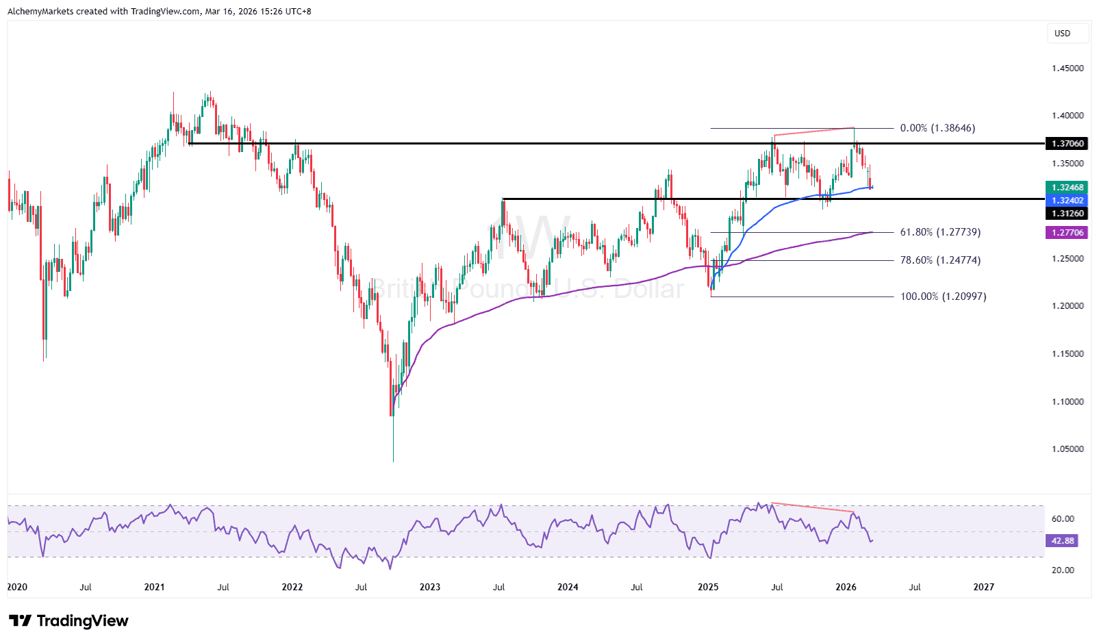 After rallying strongly throughout 2025, the pair has started to stall near the 1.324 region, where upside momentum has been slowing down (notice the bearish divergence).