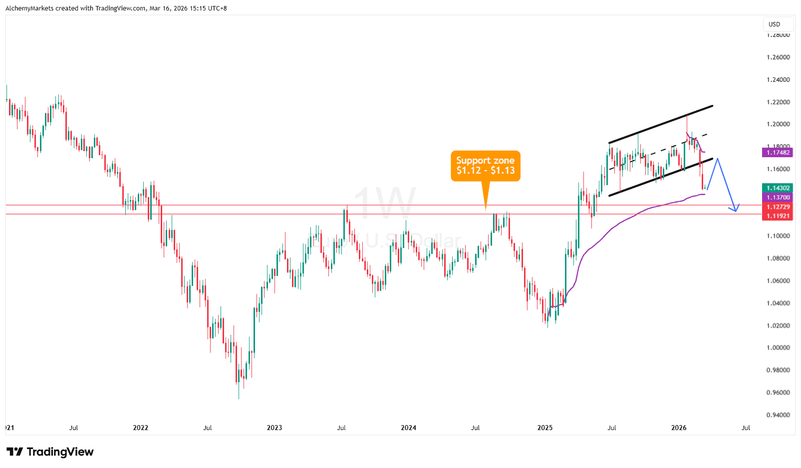 However, a sustained break below the 1.12–1.13 support zone would signal that the euro is losing a much larger structural support level.