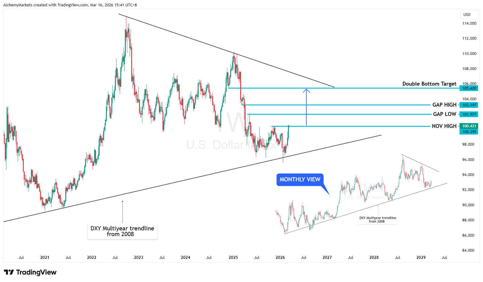 If the index continues to hold above that level, the next region to watch sits between 101.9 and 103.2, where an unfilled gap remains.