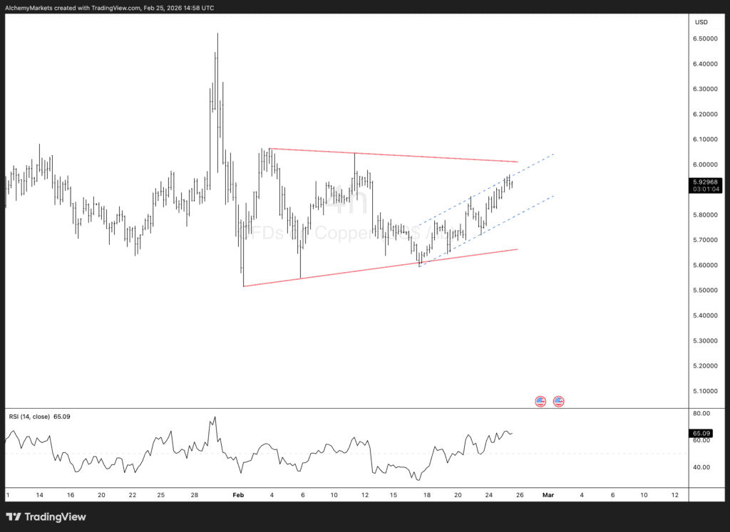 Today’s Copper Chart of the Day highlights a market at inflection. After the sharp January–early February impulse, copper has transitioned from expansion to compression. Price is now pressing into the upper boundary of a medium-term triangle — but the internal structure suggests this move may be corrective rather than impulsive.