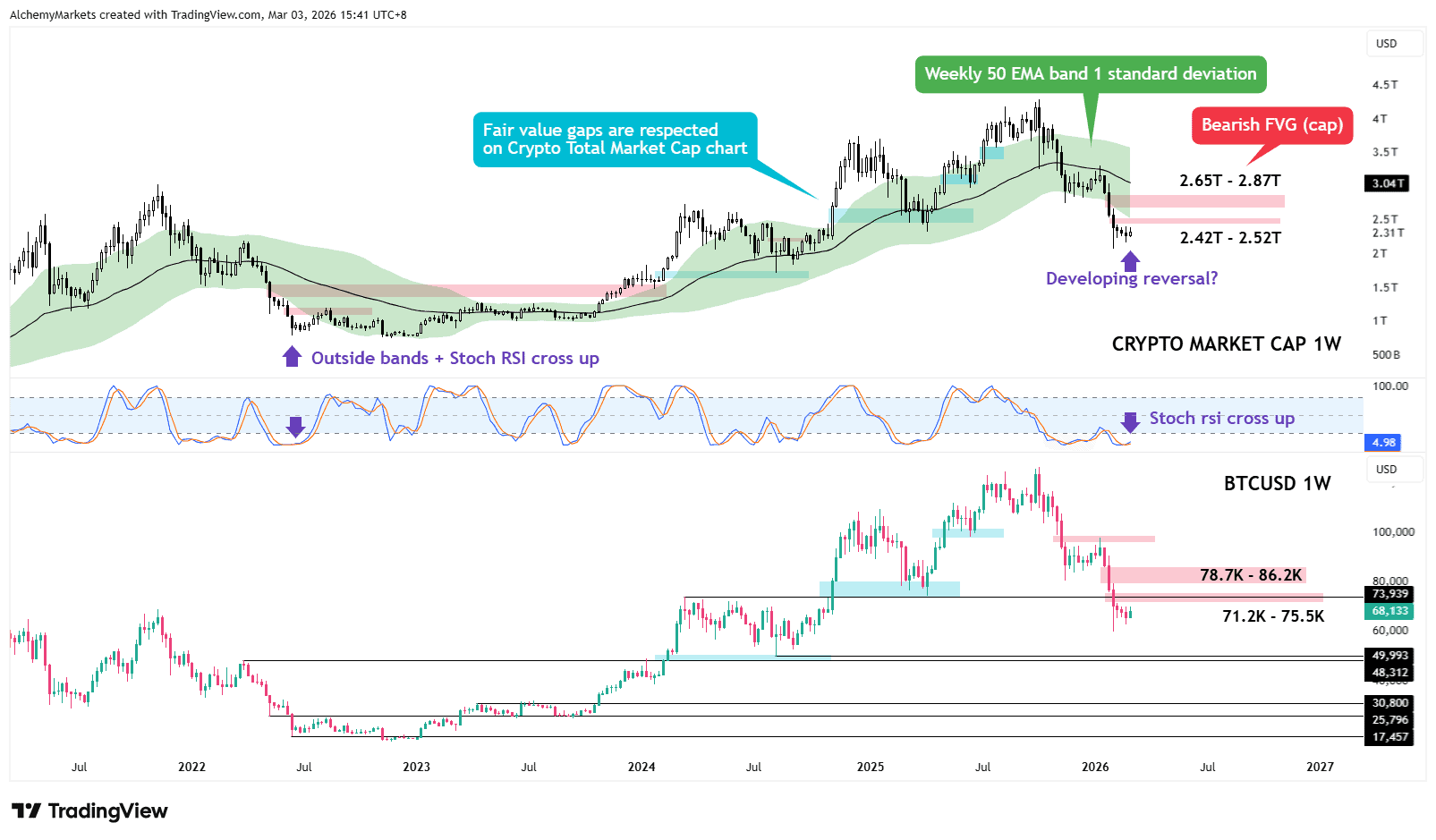 TLDR; TOTAL and BTCUSD remains capped under 2.42T and 74K until proven otherwise. A reversal signal building here implies more of a sideways drift (potentially even lower) before true recovery.