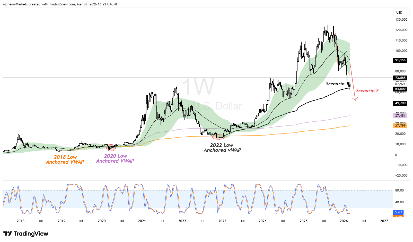 On closer inspection (on this zoomed in chart), we can see that Bitcoin is currently cooling off on an anchored vWAP from 2022, at 64K.