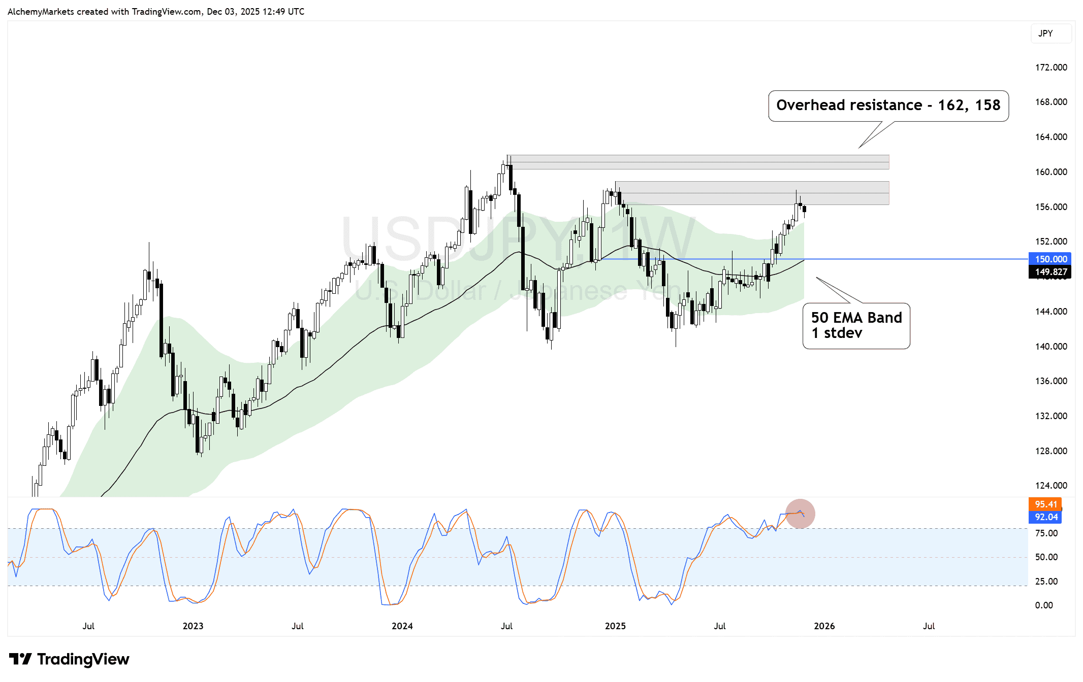 If the BOJ tightens, even marginally, USDJPY is vulnerable to a sharp unwind. Carry exposure is heavy, and options are skewed one way. A break below 155.50 opens the door for a move toward 150 or lower.