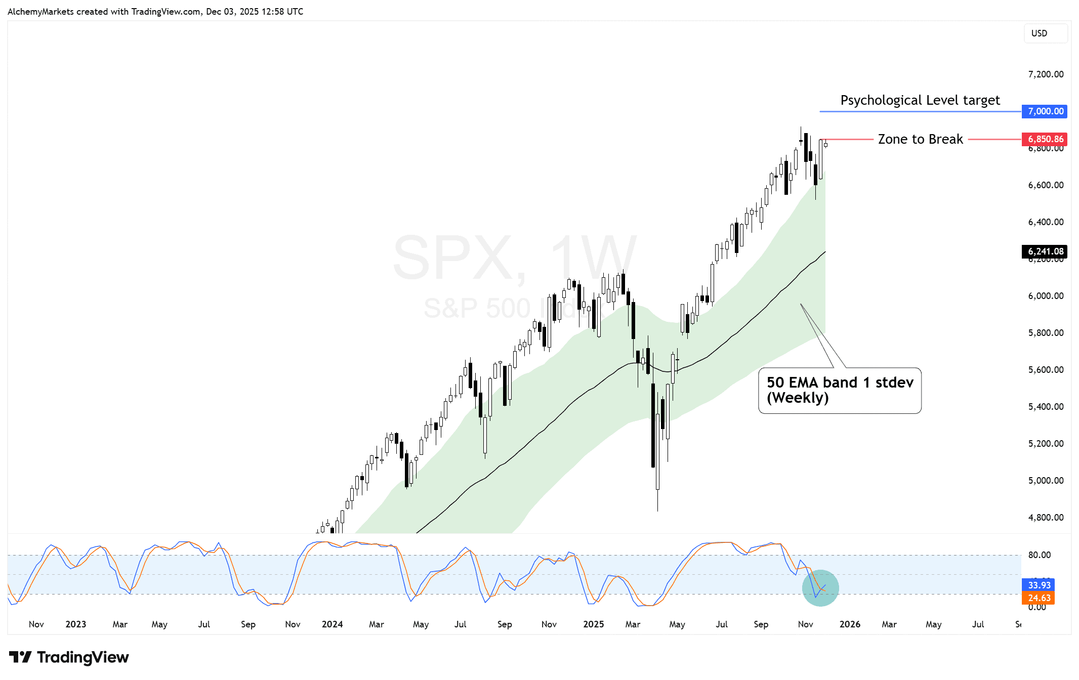 The S&P 500 respected its 20-week EMA and bounced sharply. The structure is intact, and the next resistance zone at the psychological number of 7,000 (Give or take).