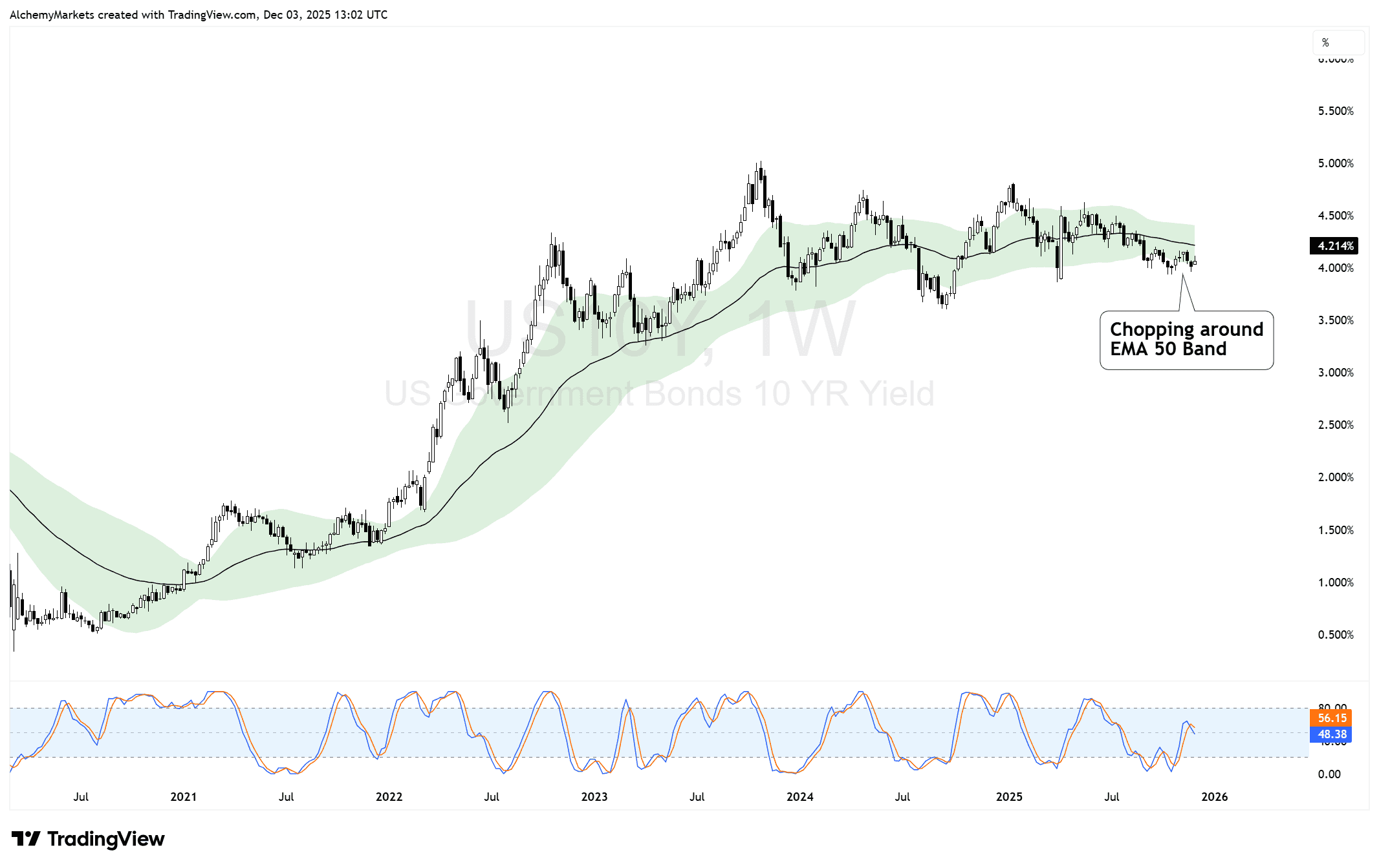 The U.S. dollar index lost the 100 level and is now drifting into the 96s. Momentum suggests further downside is likely. Positioning is starting to flip, and global flows are rotating toward non-dollar assets as expectations shift toward looser policy in Europe and Asia in 2026.