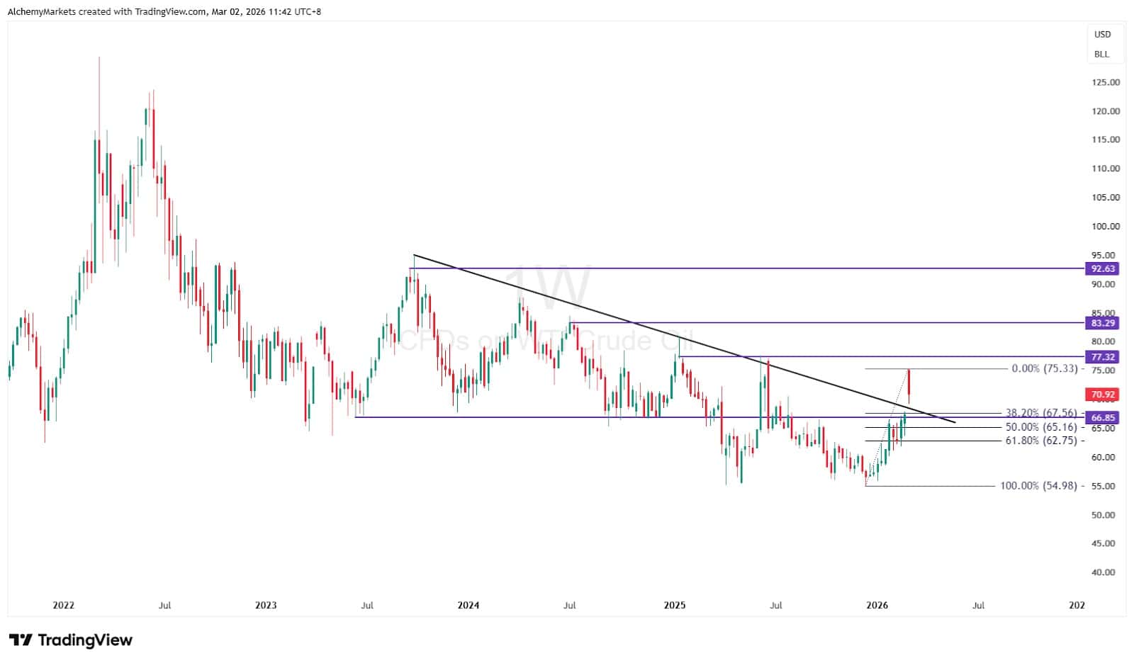 The weekly chart shows crude rebounding strongly from the $55 region, where buyers previously stepped in earlier this year. From there, prices rallied back toward the mid-$60s, breaking above a key resistance level ($67) and hinting at a trend reversal.