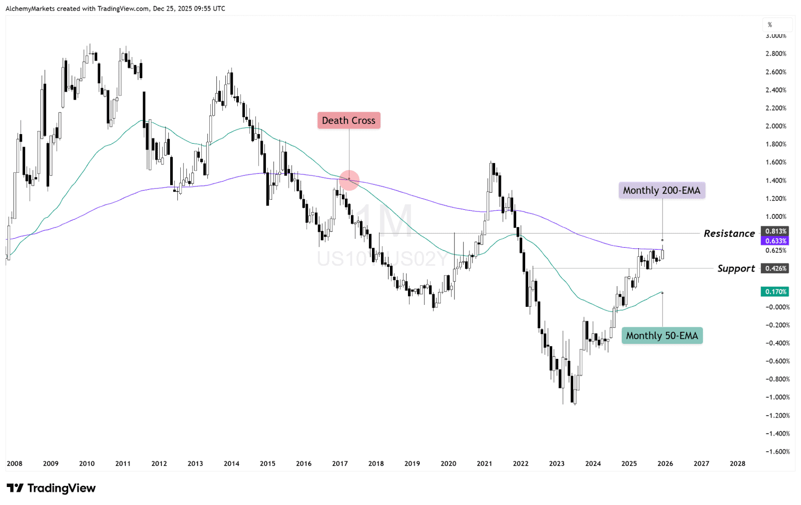 US yields reinforce this interpretation. The 10Y–2Y spread on the monthly chart suggests the most restrictive phase of policy is behind us. The curve has begun to normalise, signalling easing pressure rather than renewed stress.