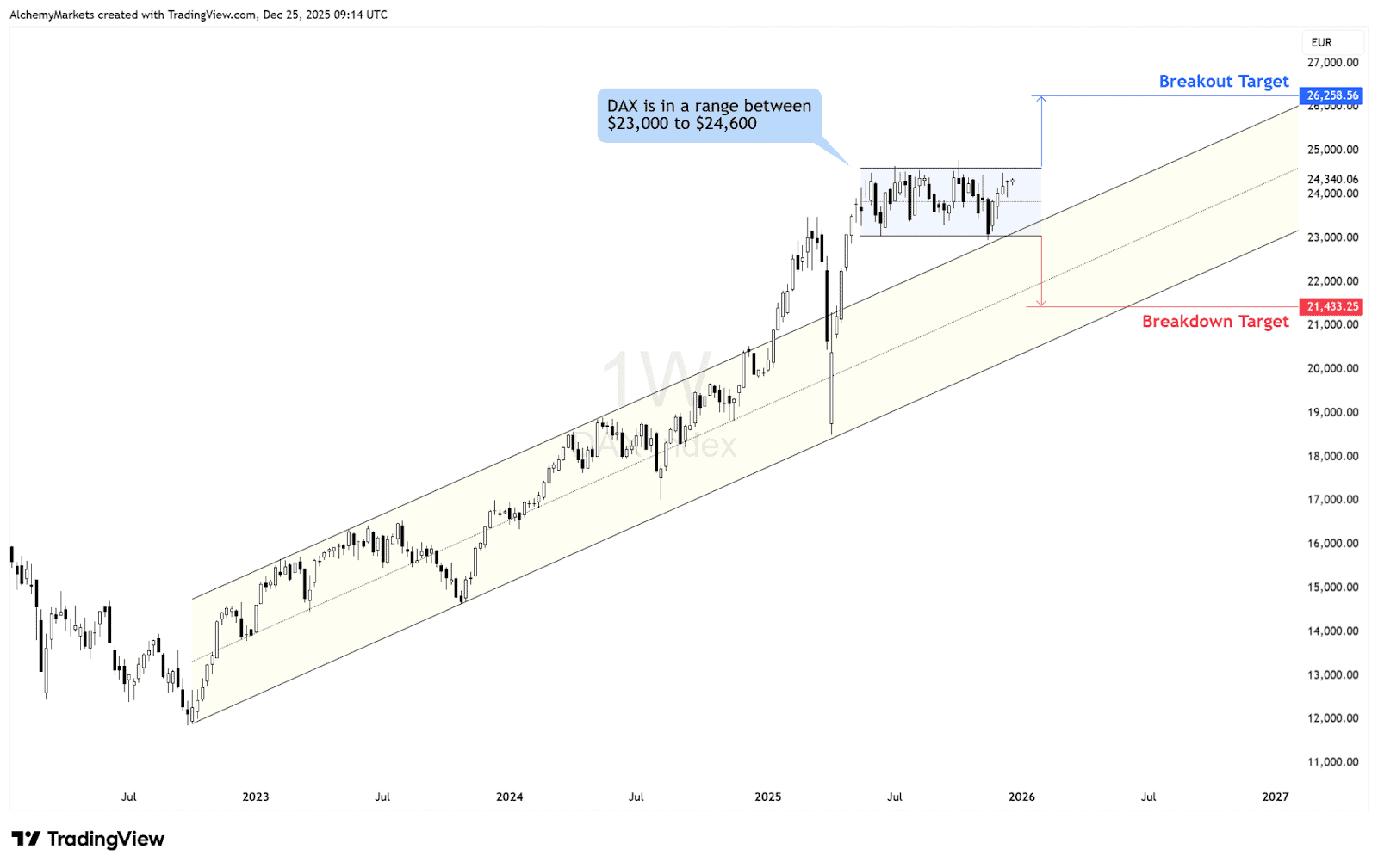 European equities remain constructive, but less self-driven. Here we have the Dax (CFD: DE30 on Alchemy Markets) weekly timeframe.
