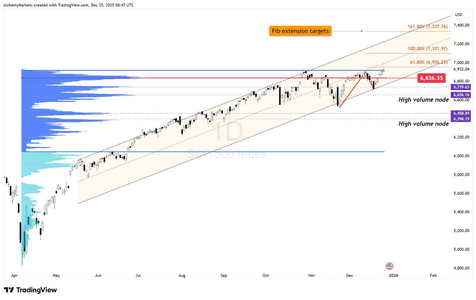 The S&P 500 remains the anchor for global risk sentiment. Here we have the S&P 500 (CFD: US500 on Alchemy Markets) daily timeframe, with volume-profile based trading levels.