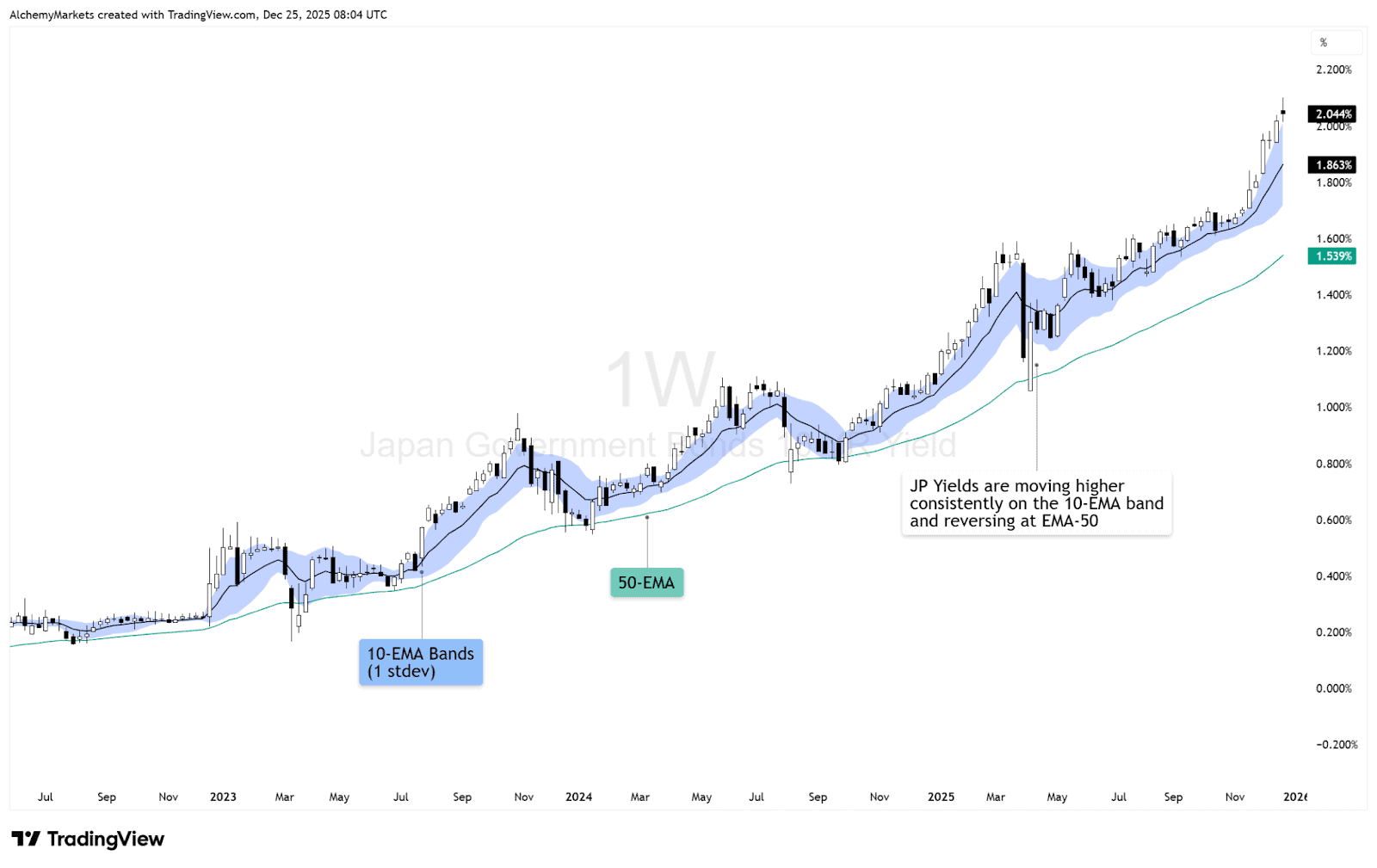 That regime has clearly changed in 2025. Japanese 10-year government bond yields have risen to their highest level in over a decade, pushing above key technical levels and trending firmly above the 10-EMA. This is not a short-term spike. It reflects a structural shift away from extreme yield suppression.