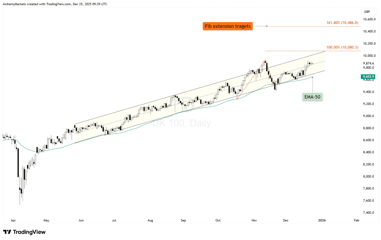 The FTSE reflects the defensive side of global rotation. Here we have the FTSE (CFD: UK100 on Alchemy Markets) daily timeframe.