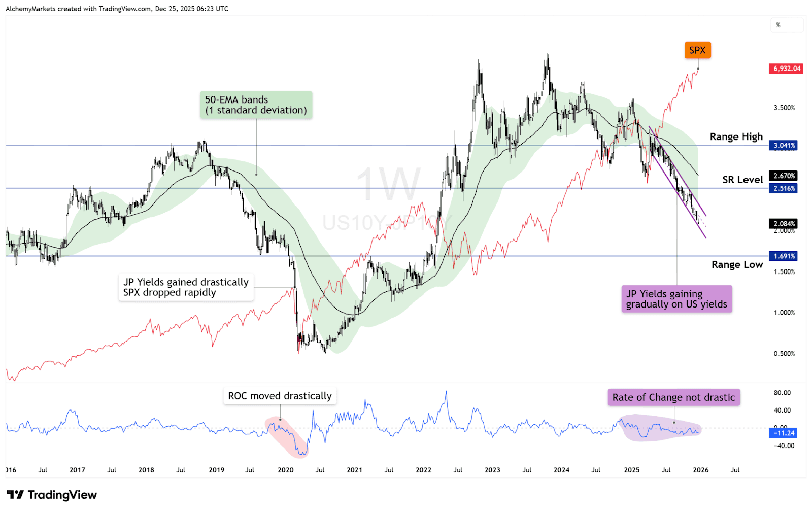 | The 2020 Comparison: In the first highlighted section, the Rate of Change (ROC) moved drastically. As Japanese yields gained ground rapidly, the SPX experienced a sharp, vertical drop.The 2025 Context: Current data shows a different story. While Japanese yields are gaining, the transition has been gradual and technically orderly. The ROC is currently stable, rather than impulsive. |