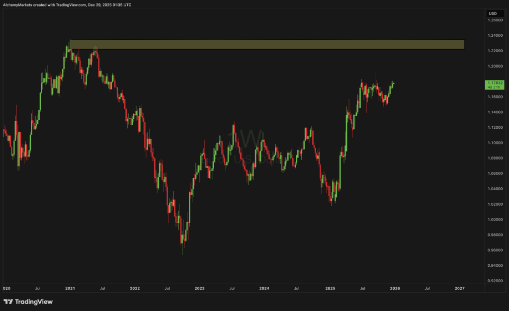 From a technical perspective, EUR/USD remains constructive. The pair has established a clear higher-low structure following its 2022–2023 base and continues to respect medium-term support zones. Price action suggests sustained upside momentum rather than a corrective rally.
