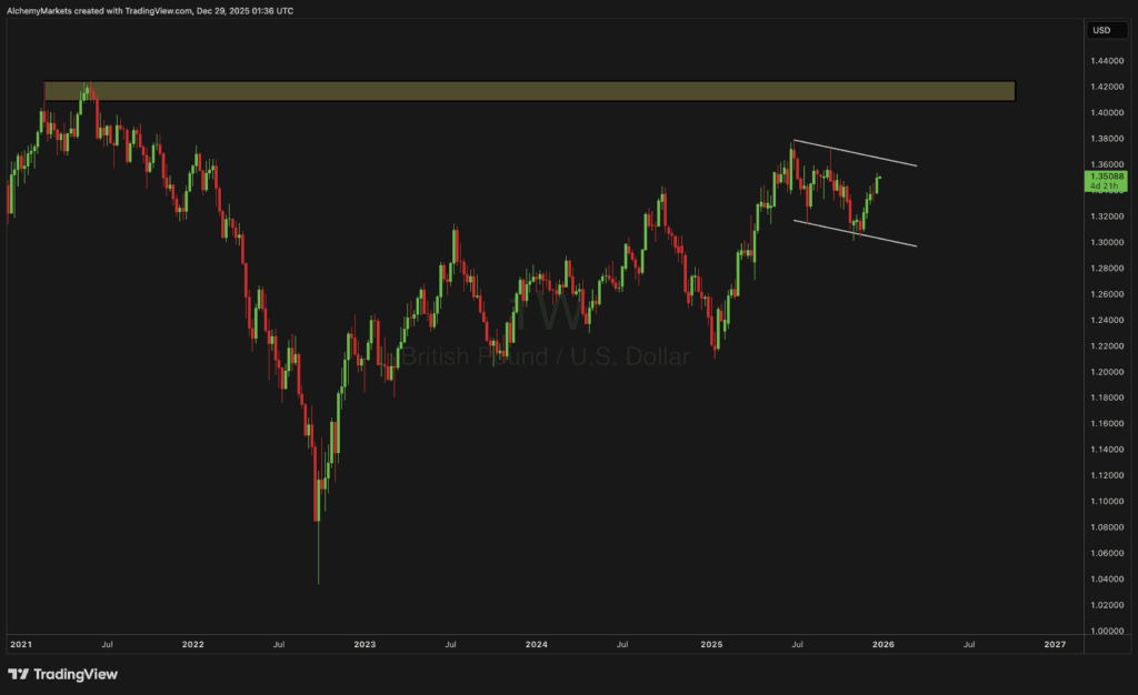 From a macro perspective, the backdrop remains quietly supportive. With the Federal Reserve easing and the Bank of England maintaining a cautious, measured stance, rate differentials are no longer a meaningful headwind for sterling. Provided UK data avoids material deterioration, macro conditions do little to obstruct a technical breakout.