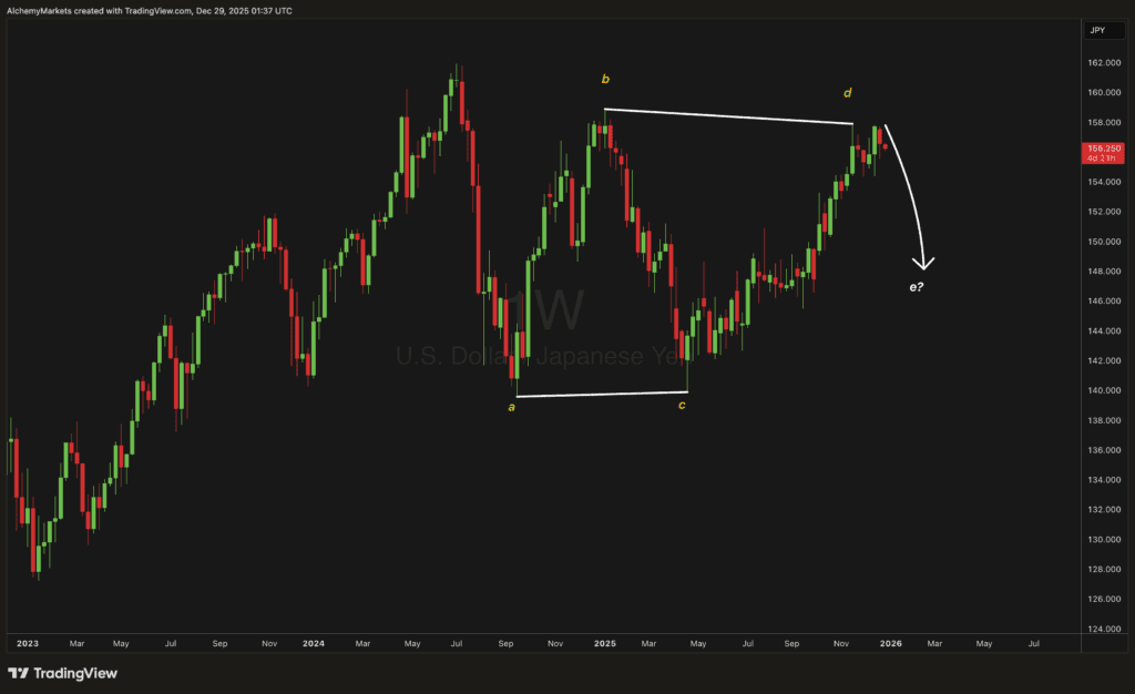 USD/JPY is at a technically delicate point. After an extended advance, the pair appears to be completing a broader corrective structure. The price action aligns with a potential move into an Elliott Wave triangle wave E, suggesting scope for a deeper pullback rather than immediate continuation higher.