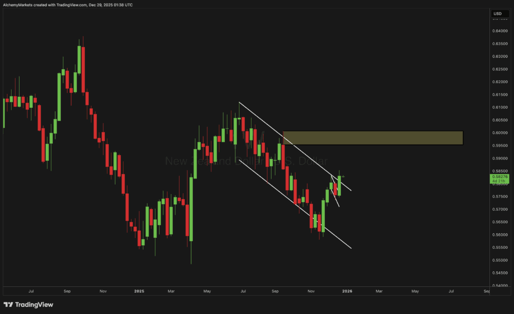 NZD/USD has broken higher from a bull flag, confirming a medium-term shift in structure. However, the follow-through appears measured rather than explosive.