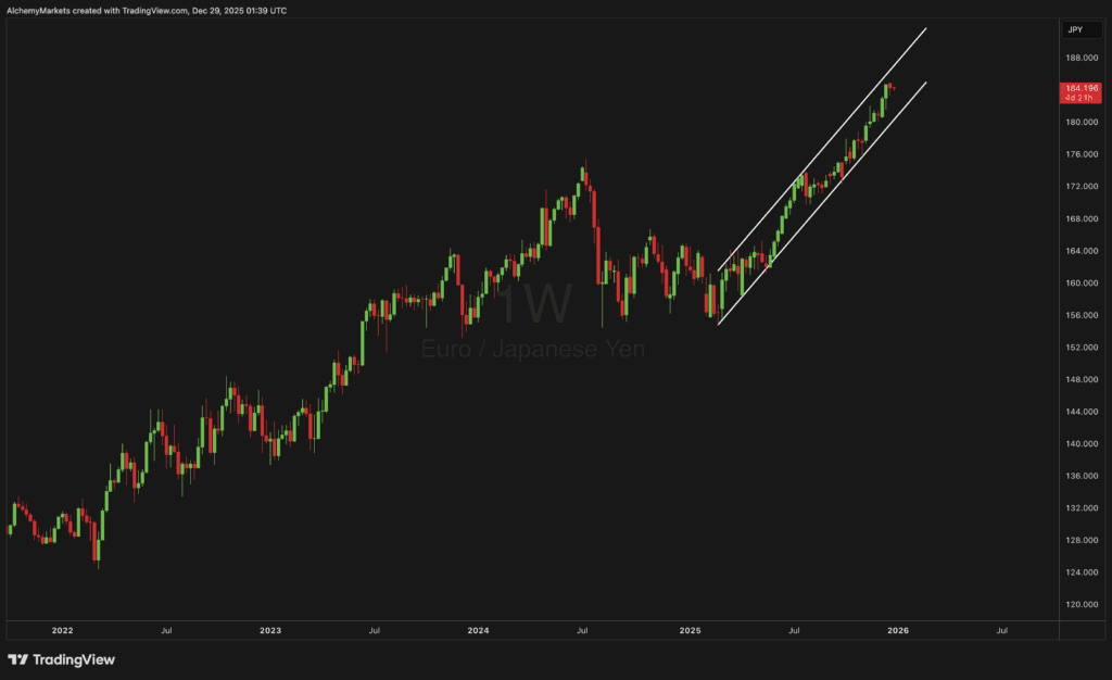 EUR/JPY is trending strongly but increasingly sits in no man’s land. The pair continues to climb within a rising structure, yet momentum indicators — particularly RSI — are now overbought.