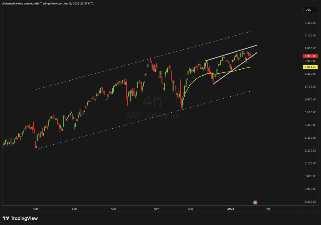 Taking a look at the 4-hour SPX chart, the index remains within a well-defined ascending channel that’s been in place since mid-2024. Recently, price action has carved out a rising wedge pattern — typically a sign of potential exhaustion near the top of a trend.